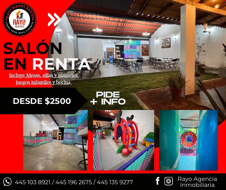 Incluye Salón, mesas, sillas, manteles, juegos infantiles y bocina.